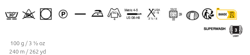 Cada ovillo tiene 100 gramos y 240 metros. Este hilo es de grosor fino, recomendamos usar agujas del 3,5-4. Para realizar un jersey de mujer de manga larga talla 42 se necesitan 4 ovillos. Para la muestra 10x10 cm trabajar 22 puntos y 29 vueltas. Se puede lavar a máquina hasta 30ºC con programa de lana y se puede secar en secadora.